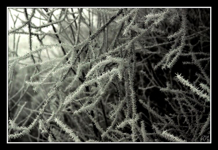 je voudrais t'encourager à penser un peu plus ce que tu as dans le viseur et te demander pourquoi ça marche. Je m'explique: ici c'est le contraste sur l'arrière plan qui met en valeur les aiguilles de givre, en plus avec la ligne des arbres ça nous donne un contexte et une dimension, impeccable; le souci pour moi c'est que ce n'est que partiel alors que tu aurais pu jouer avec ça et trouver un angle et peut être une focale différente pour inscrire tes aiguilles sur un fond nickel tout en ayant en même temps construit sur la même photo un paysage en arrière plan, quite à cadre moins serré peut être parce que ton sujet n'est plus la branche mais un paysage traité en flou d'arrière plan et mis en valeur par le premier plan, voili, j'espère que c'est clair