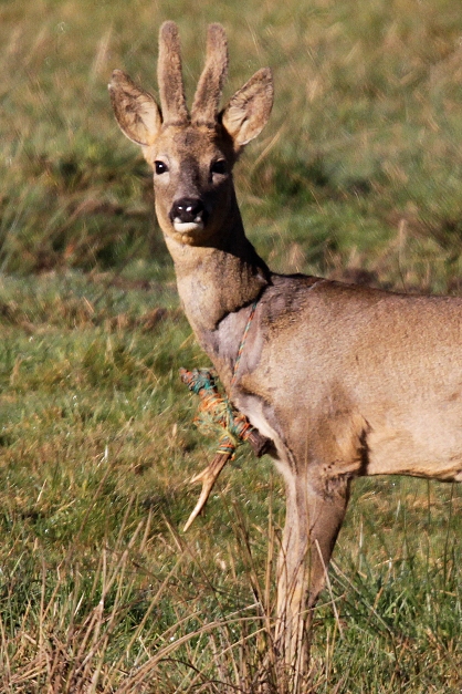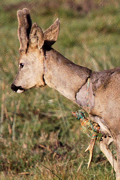J'ai repéré ce brocard ce matin, manifestant une curieuse démarche (anormale de prime abord) ; après observation aux jumelles puis approche et photos, l'animal semble avoir perdu ses bois à l'automne dernier comme tous les autres mais ici, il les a perdus enroulés dans ce qui semble être un fil tressé de clôture éléctrique, avec une boucle autour du cou ; il a beaucoup cherché à s'en débarraser : cou pelé et marque près de la tête (photo 3) , ça le gêne pour marcher car à chaque pas, les vieux bois tapent sur ses pates avant ... MAIS IL EST VIVANT ... jusqu'à ce que ce joli collier s'accroche à nouveau quelque part ... IL EST INCASSABLE.