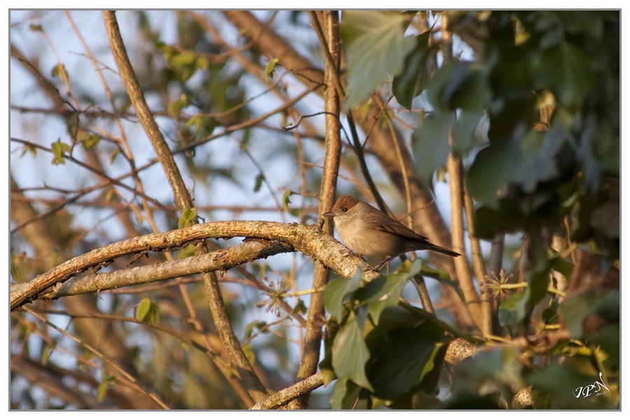 Dans le même esprit que le pinson, cette femelle fauvette au coucher du soleil... dans son garde manger temporaire