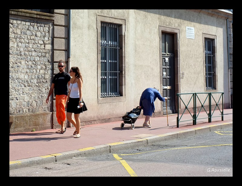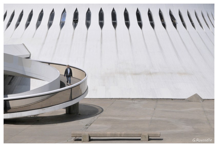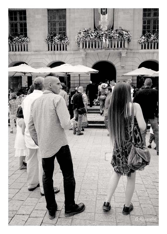 La 1, j'aime bien! Joli mouvement fluide des corps en 1er plan qui mettent entre parenthèses le couloir qui nous mène à l'entrée du bâtiment. Petite crête de poulet maladif qui rajoute un petit plus et joli petit morceau à droite