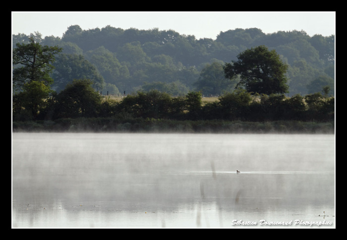 Toujours dans le brouillard, je prends la direction de l'affût des trois bouleaux non sans avoir fait le tour de l'anse que Roland nous avait gentiment indiqué comme un bon "spot". Dans la brume, je distingue un Grèbe huppé entrain de prendre tranquillement un petit déjeuner à base de poisson chat. J'entends une Poule d'eau ainsi qu'une Bergeronnette des ruisseaux tandis qu'un Milan noir me survole à très base altitude à cause du brouillard qui l'empêche pour le moment de distinguer les poissons morts à la surface de l'eau.
