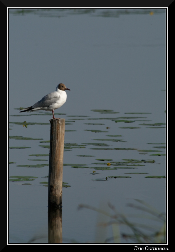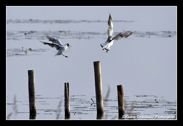 Arrivé à l'affût, je fais le tour des lieux et me poste à une ouverture qui m'a l'air intéressante. Devant moi, une troupe de Mouettes rieuses s'affaire à leur toilette matinale et "joue" à leur jeu favori qui est le "pousse toi de là que je m'y mette" sur les piqués en bois disposés dans l'eau devant l'affût.