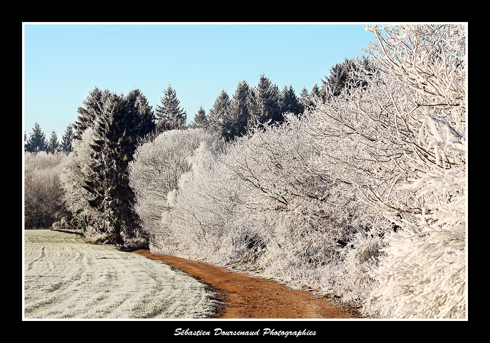 Il faisait -6°C et je marchais paisiblement dans un petit chemin de campagne caillouteux qui longeait une crête devant me mener sur une hauteur d'où l'on a une vue imprenable sur le sud du département, du plateau de Millevaches jusqu'aux Monts des Cars.