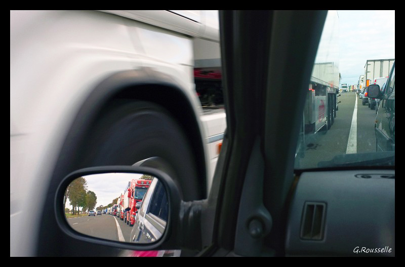 En attente dans un embouteillage sur la RN 20(pour cause de travaux)je me suis décalé limite bande blanche pour avoir dans mon axe de vue la file d'attente devant moi et son prolongement dans mon retro,et j'ai attendu qu'un camion venant en sens inverse arrive a ma hauteur et me frôlant,pour déclencher,après plusieurs essais j'ai fini par avoir ce que j'avais imaginé dans ma petite tête, comme mise en image,alors je vous représente cette image toute seule pour voir si elle est intéressante ou pas,ou confirmer, que vous avez volontairement bien fait de ne pas la commentée.:P