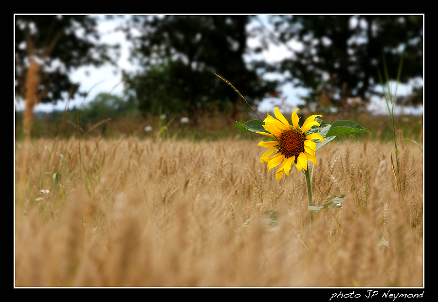 Ce tournesol, seul au milieu de ce champ de céréales...