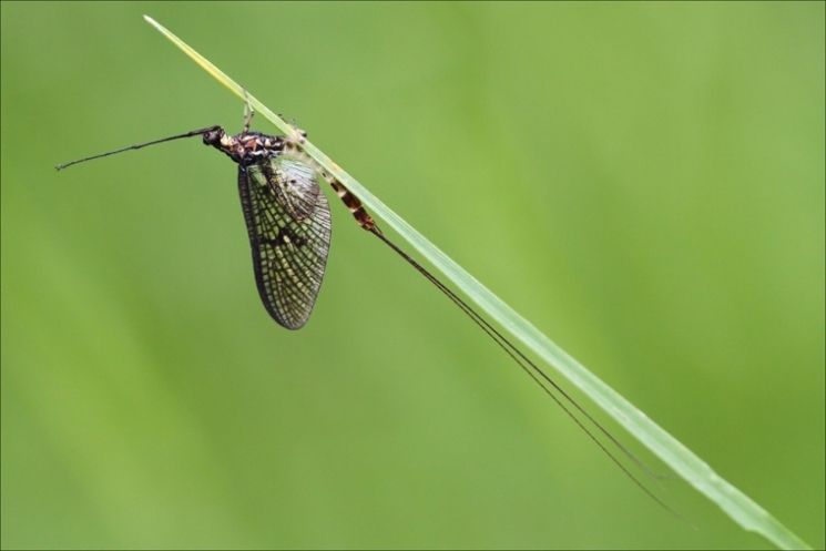Ephéméra Danica, imago mâle, ... on l'appelle aussi et surtout "mouche de mai", éphémère dont rafolent les truites, très imitée et très prisée des pêcheurs à la mouche ; y'a du festin dans l'air