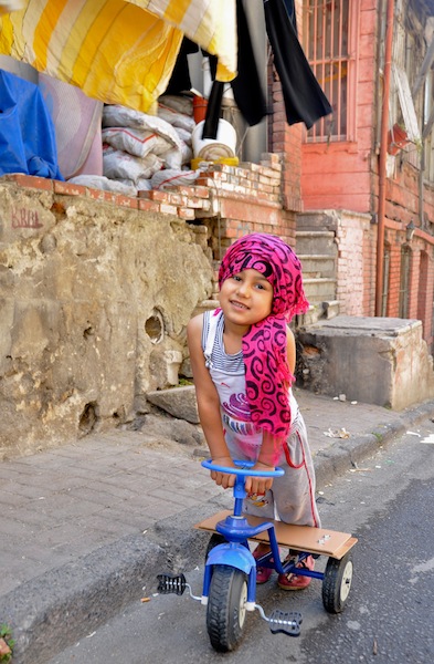 Une petite fille et son tricycle dans une rue de Sultanahmet