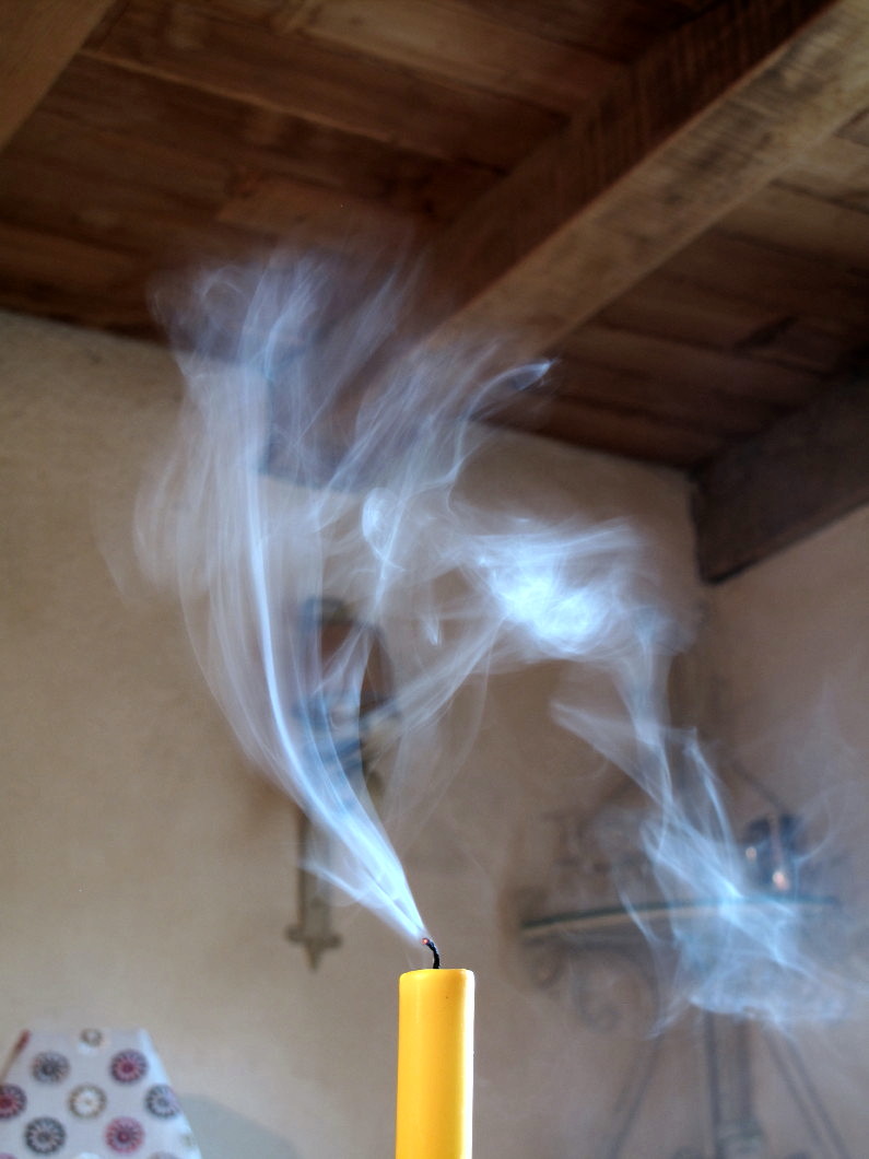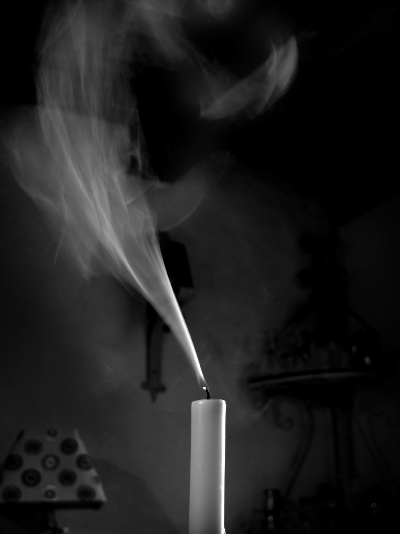 1- trouver un fond noir ou très sombre avec un éclairage latéral (fenêtre) qui fasse ressortir la fumée de la bougie.