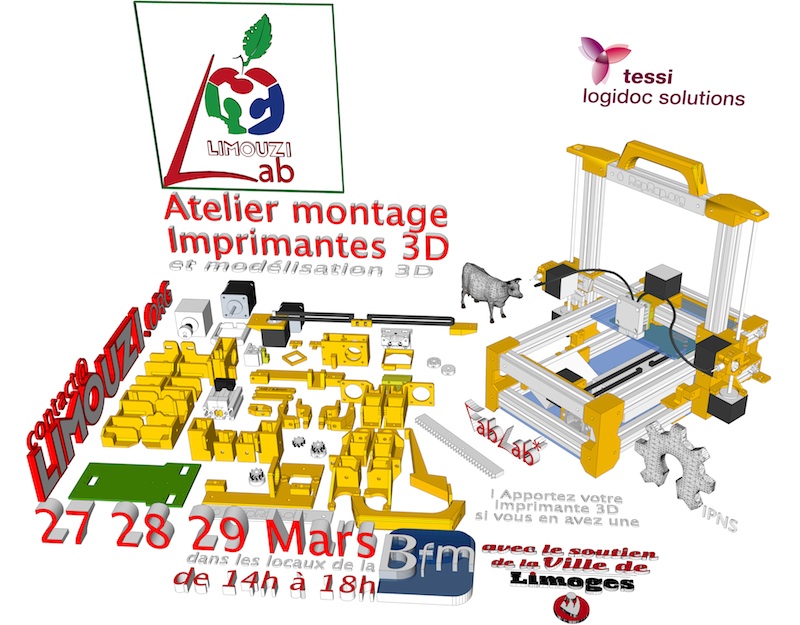 Il s’agira de proposer aux personnes de monter une imprimante 3D (kit reprap) sur les 3 après midi. (Chassis jour 1, électroniques jour 2, réglages puis impression jour 3, suivi d’une conférence sur l’impression 3D).