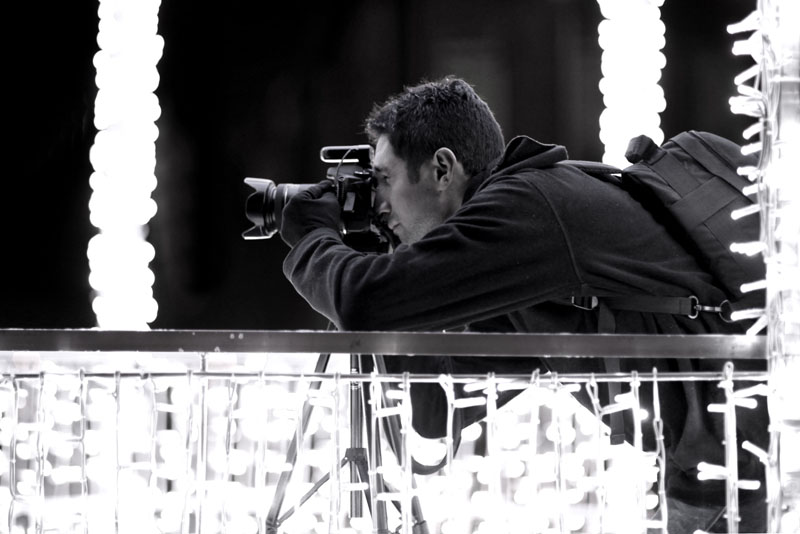 Des photographes en action, en noir et blanc.