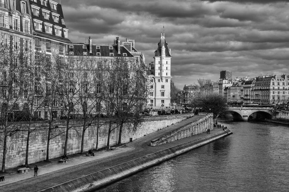 Cette image montre des humains flanants sur les bords de Seine, promeneurs, amoureux enlacés, puis à un étage de plus s'étend le quai des Orfèvres et son célèbre 36... Là le ciel s'assombrit pour certains, la brigade criminelle, la brigade des stupéfiants, la BRI... bref que des humains ...