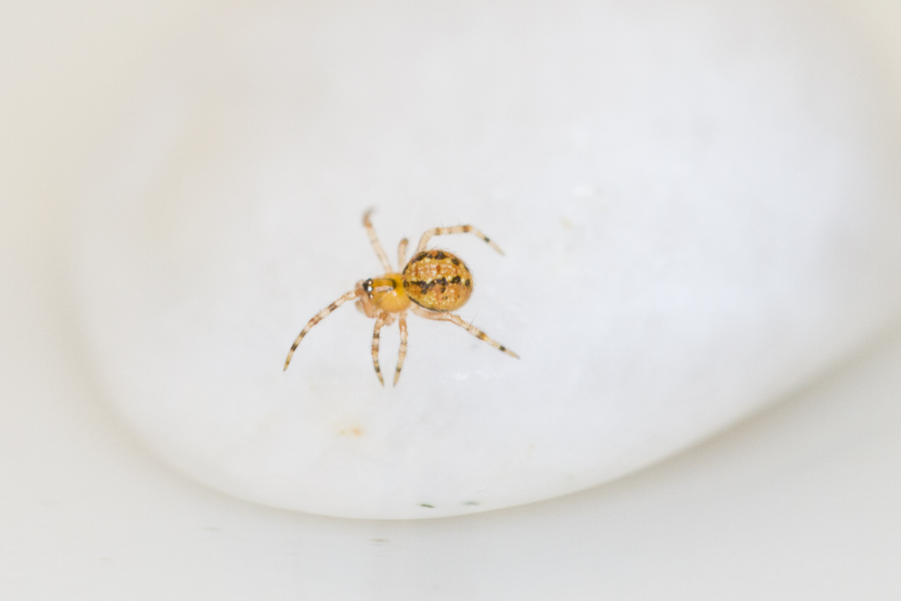 Initialement, j'ai essayé de photographier cette petite araignée (qui doit faire 2 ou 3 mm) sur une surface plane et blanche, mais la bête est vraiment vivace et n'apprécie pas trop la lumière des projecteurs (de simples lampes led dans le cas présent) !