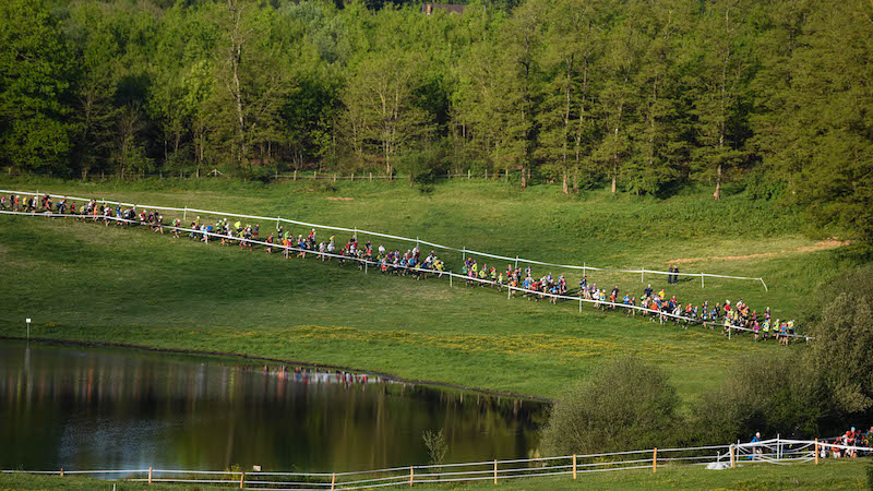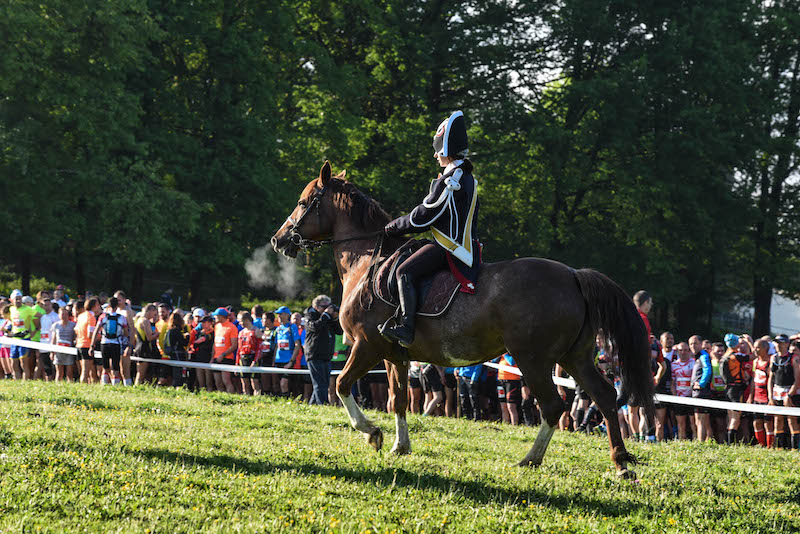 Un départ des 32 km très festif et bien orchestré. Après le saut de 2 parachutistes les 2200 à coureurs ont fait un tour d'honneur derrière trois gendarmes à cheval sur fond de Carmina Burana.