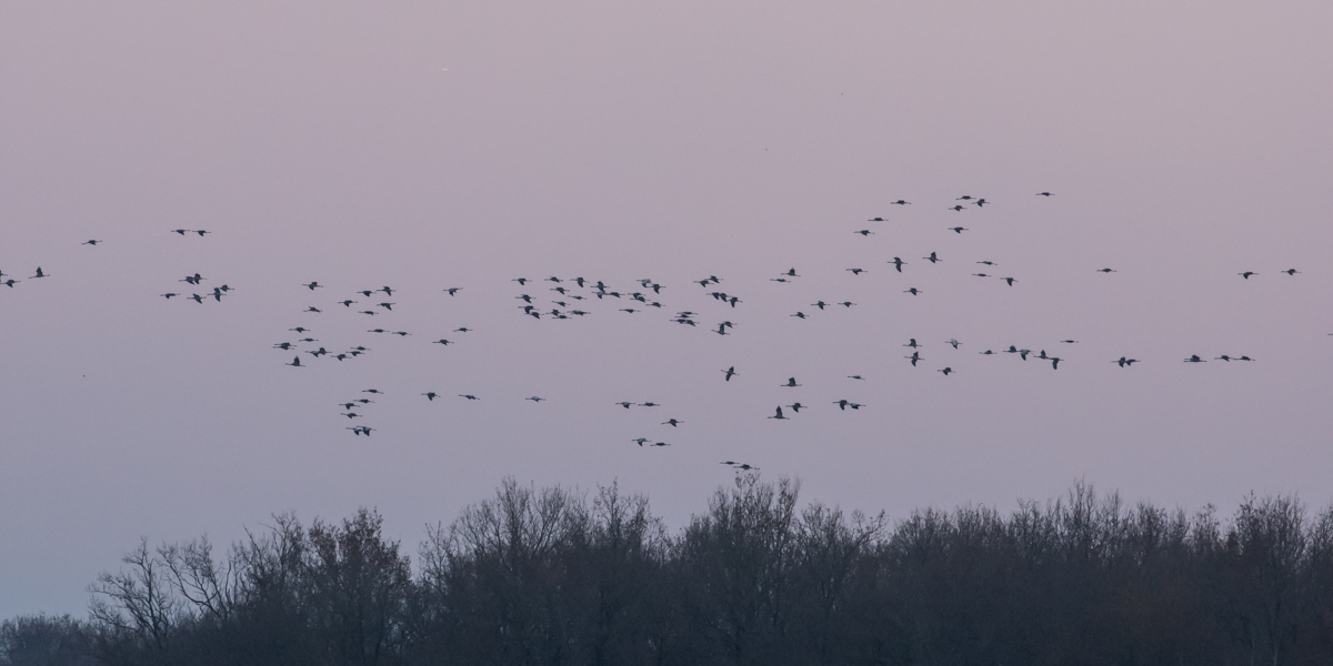 Lever à 5h hier pour arriver avant le lever du soleil, afin de voir les grues décoller au matin. Bien arrivés assez tôt mais le temps de trouver un spot où l'on puisse se garer et les observer, le soleil était levé.