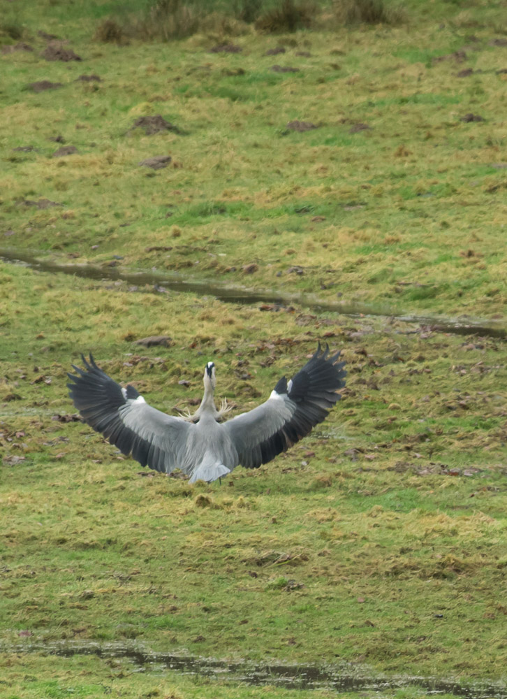 L'air, la terre et l'eau... Atterrisage du héron dans la prairie "humide"
