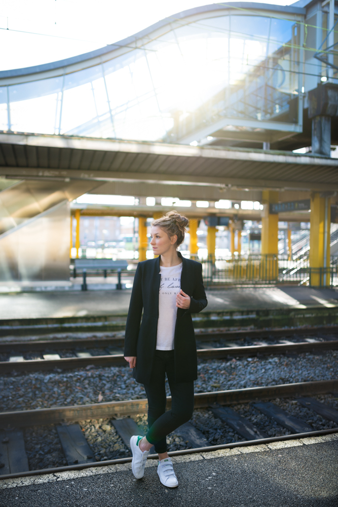 Pour la 3eme je trouve que veste planche apporte une lumière et un reflet intéressant que le noir n’aurait pas apporté. Apres pour le pentalon la modele etait partie sur ce modele noir. J’avoue que le blanc aurait etait plus sympa pour la deux..mais d’etre en ville n’est pas forcement le plus facile pour changer de tenue comme ca. Pas la facilité du studio ou de la photo d’interieur.