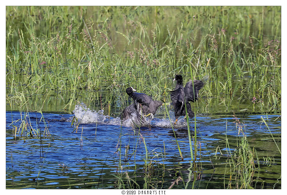 Combat de coqs pour les Foulques macroules pendant la charge sur l'intru pour le Fuligule milouin. Le canard Souchet préfère partir se mettre à l'abri