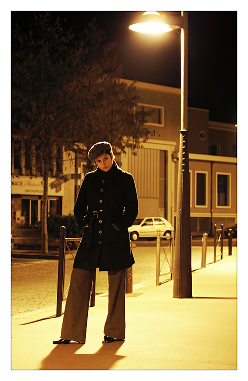 Elle est de pied, de nuit en lumière "naturelle", et en ville. De plus la posture de Marie est plus qu'expressive et ses habits très gavroche vont avec.