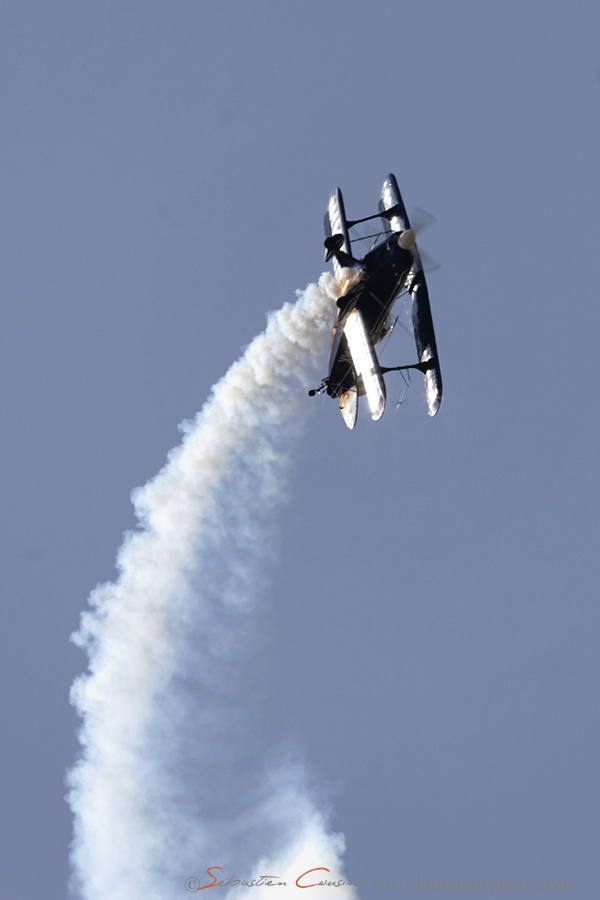 Sinon, Nico, alors pour tes questions : c'était mon premier essai de meeting avec ce matos, donc je ne peux pas trop être sûr de ce que j'avance, mais pour te donner mes impressions, je crois que le plus dur est de réussir à garder l'avion dans le cadre et surtout pour les fumigènes de savoir à quel moment passer en portrait et quel moment en format paysage : l'avion passe très vite d'un vol horizontal à un vol vertical... du coup dur d'avoir l'avion et les trainées de fumées sur la même photo... dans le bon sens...