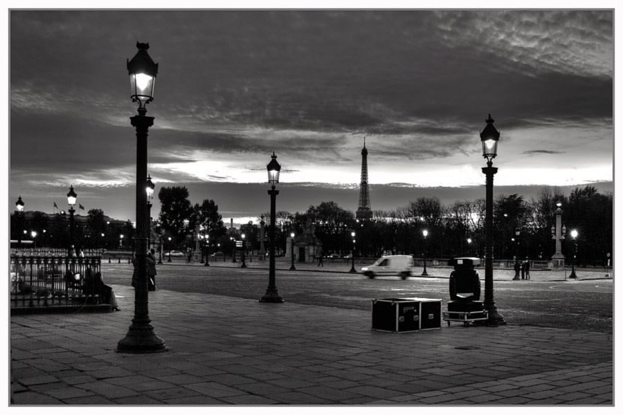 En fait, j'ai fait la photo parce que j'ai trouvé que le "tas de ferraille" (tour Eiffel) au milieu de ces lampadaires allumés ressemblait à un intru... A priori, le message n'est pas passé. Tant pis, reste la lumière....