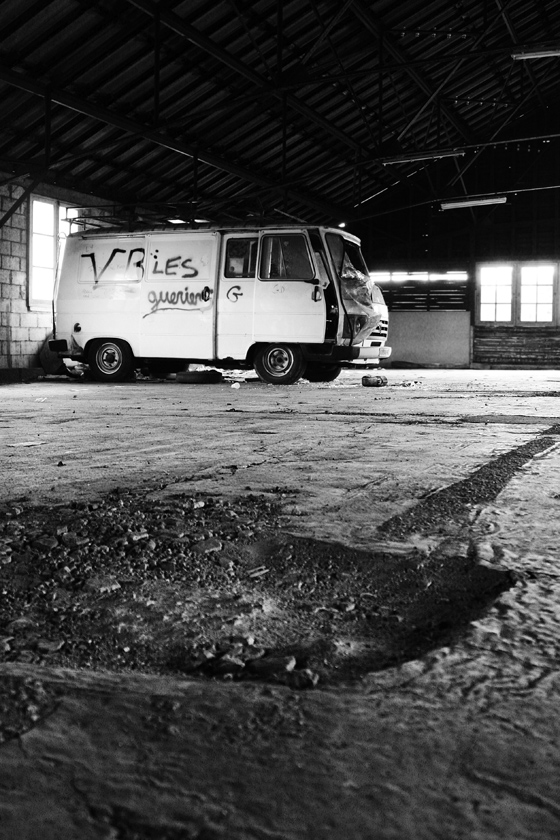Je suis partagé... L'idée du cadrage vertical me séduit parce qu'il coupe toute perspective à ce camion en ruines, alors qu'un horizontal donnerait obligatoirement du champ à droite... donc de l'avenir (c'est que j'ai lu mes classiques....). Je ne connais pas la config de l'endroit, mais il n'est pas impossible que ça enlève de la force au trou au premier plan..