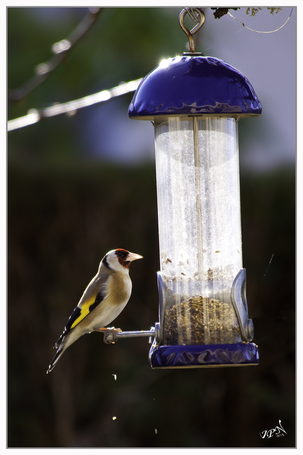 Bon, d'accord, il est sur la réserve de graines, devant la maison... mais ce chardonneret élégant porte bien son nom, non?... et ses couleurs vont bien avec le bleu de la mangeoire...