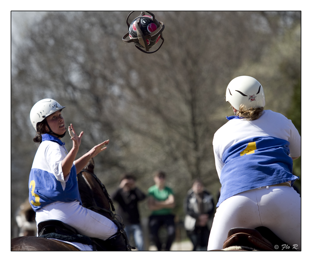 Je suis allée voir du Horse ball féminin. Deux equipes à cheval, s'affrontent, doivent réaliser un enchainement de 3 passes et marquer un panier, sans faire tomber la balle et sans se la faire piquer par l'autre équipe bien sûre.
