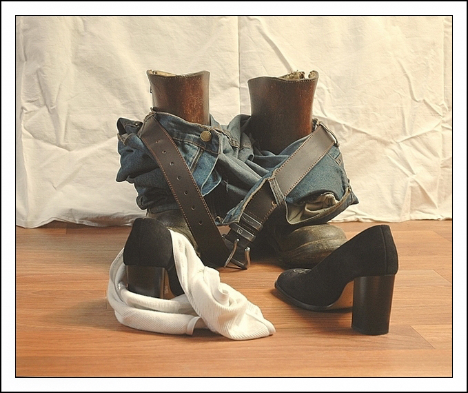 Même ressenti que GG et Eric : les godasses, il y a une idée interressante, mais le drap blanc et même le sol absolument clean ne collent pas ; je la verrais bien devant une chaise ou un fauteuil, ou pourquoi pas en pleine nature devant une botte de paille (mais l'éclairage serait peut-être plus complexe à mettre en place).
