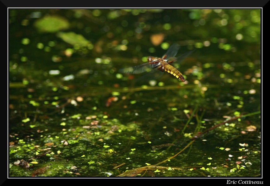 Pour tout vous dire, la libellule passait continuellement devant moi pour faire un court stationnaire à moins d'un mêtre. Après plusieurs essais en autofocus qui était manifestement à la rue, je suis passé en MAP manuelle et j'ai 2 images plus nettes à part la tête.