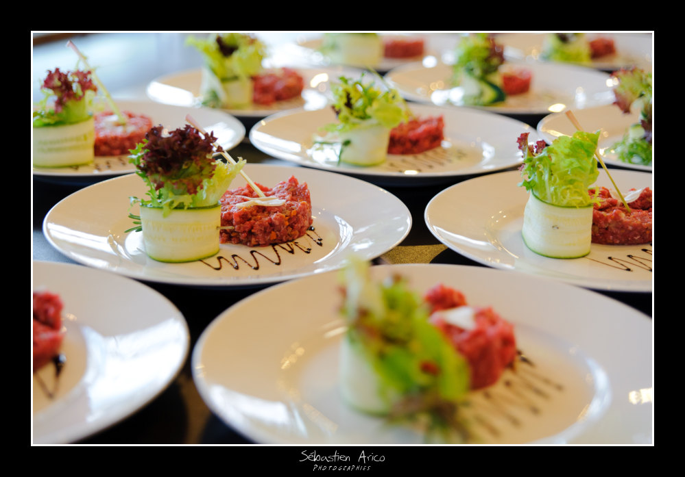 - sur la 1, je trouve qu'il manque de la pdc pour avoir le plat net en entier. De plus, la map est sur le tartare qui est dans l'ombre projetée du fagotin de salade flou. Du coup, l'élément le plus visible et le mieux éclairé du plat est le fagotin flou