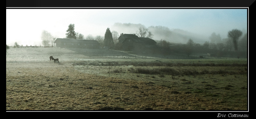 Perso, j'ai choisi de positionner les équidés sur un point fort parce qu'il me semblait que la légère diagonale qui part de l'angle droit en bas menait l'oeil d'abord vers les chevaux pour se terminer dans les buissons qui redonnent un peu de matière au blanc du ciel en haut à gauche. Je ne me suis pas questionné du tout sur les bâtiments