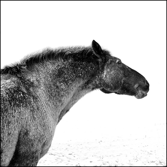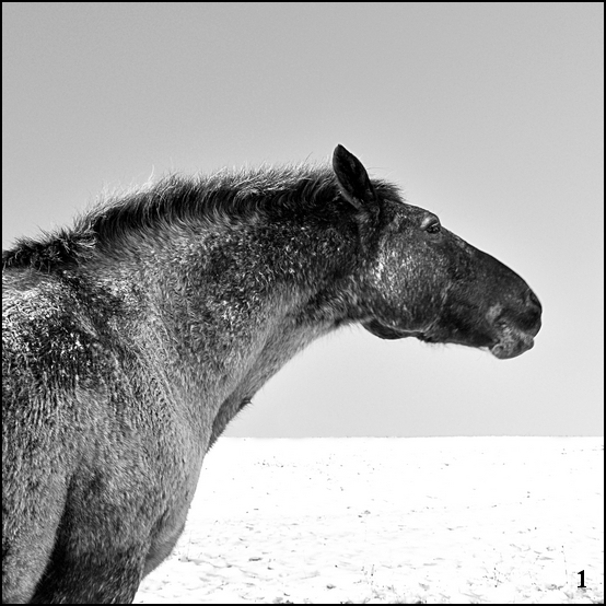 Là, j'ai fait le contraire exprès, pour donner le sentiment d'un cheval à qui la route est barrée, ce qui permet de mettre en valeur toute la masse et la puissance musculaire de l'arrière-main et de l'encolure.