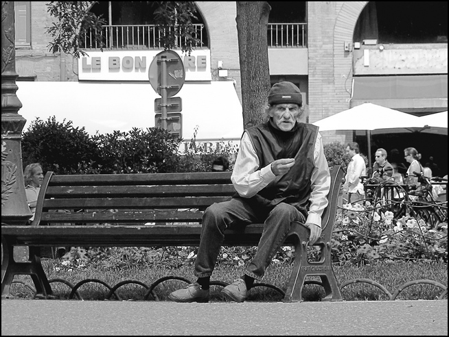Alors pour moi,on ce fout du panneau,dans la rue il y a des panneaux,il y a des gens,ça fait partie du truc,non ce qui me gène c'est le format,tu as trop isoler ton point de force en recadrant,du coup il n'est plus dans une situation qui t'a amené a faire la photo,là c'est juste un gars assis sur un banc,il n'y a plus de situation,d'histoire,remet moi ce que tu as enlevé a gauche et a droite,peut importe ce que c'est,mais c'est ça qui mettra en scène ta photo(enfin ce n'est que mon avis).;)