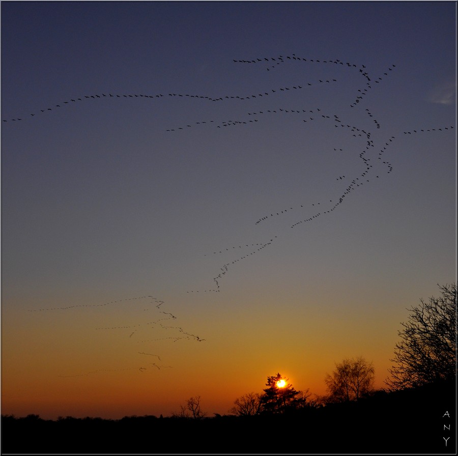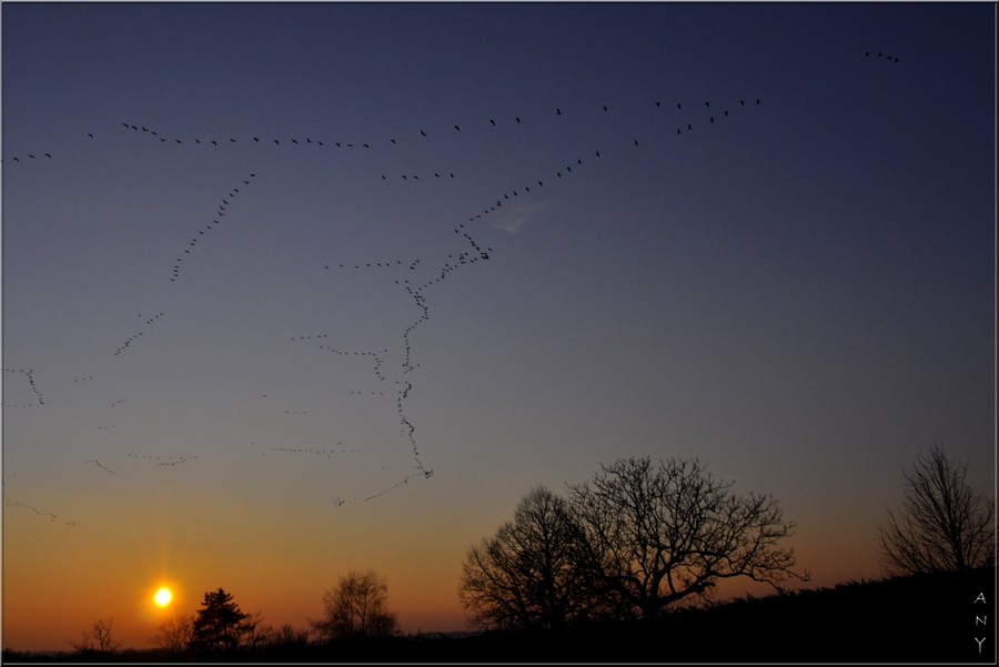 Belle série de Grues au couchant. J'adore ces conditions de prise de vue, ça fait plusieurs jours que je vais à leur rencontre en anticipant leur trajectoire grâce aux radars météo où elles sont "visibles" quand elles sont en grand nombre (dimanche soir dans le sud du département, on a vu les mêmes à 20 min d'intervalle, et hier soir dans le nord du département). Cela fait beaucoup de km mais quel spectacle de voir tous ces vols successifs qui passent pendant parfois des heures sur la même trajectoire. Partager ce spectacle avec mes enfants, ça n'a pas de prix