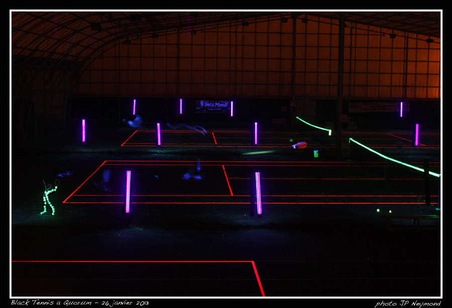 Le Casse-tête du jour... Noir absolu, lumière noire, joueurs vêtus de noir... lignes fluo, balles jaunes, raquettes noires... bref, en un mot rien à voir!... avec pour mission de pondre au moins une photo exploitable...