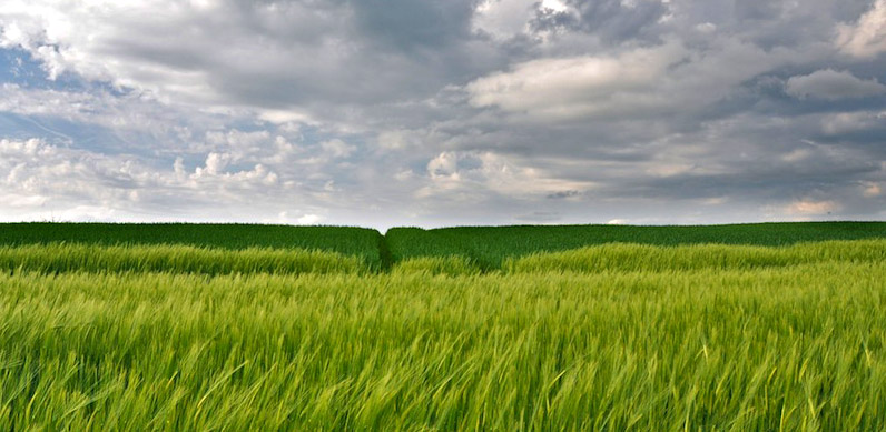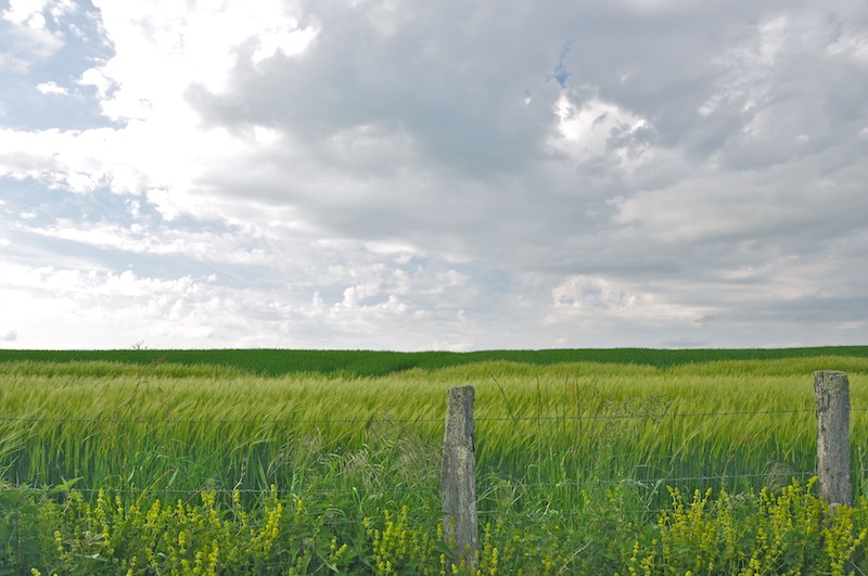 Beau contraste entre les verts de printemps et le ciel nuageux.
