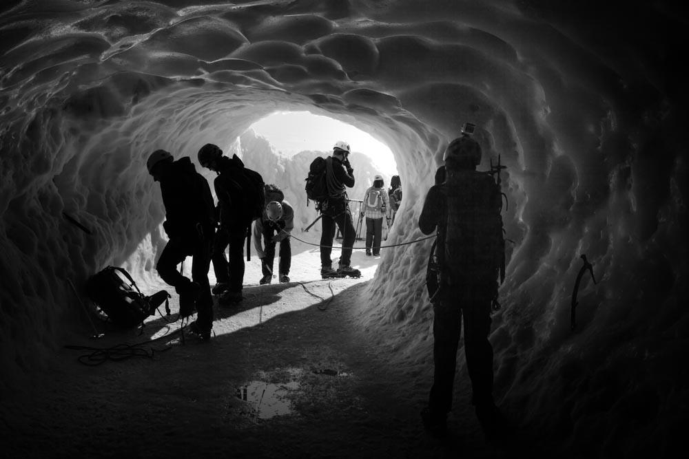 Humain ou surhomme? Départ de l'aiguille du midi hier ( 3 842 m) ...pour le Mont Blanc (4810m). Entre eux une drisse rouge.
