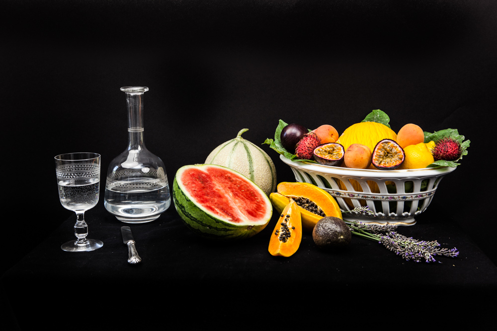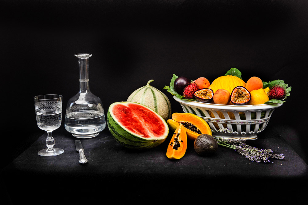 La composition me plait bien. Cette corbeille de fruits exotiques est harmonieuse ... même si je n'aurais pas été contre un peu de vin coloré dans la carafe. Coté éclairage, par contre, un ou deux "trucs" me chiffonnent: