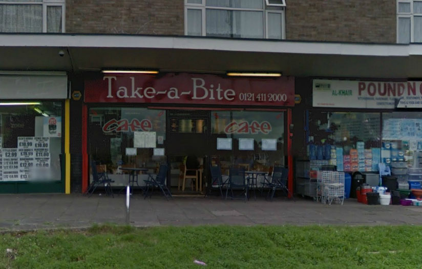 Au niveau anglais, "to eat" veut dire à manger, "take" veut dire prendre, le "a bite" n'a pas vraiment besoin d'être traduit, hein?