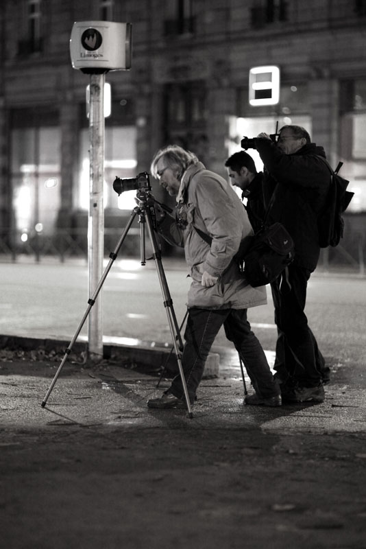 Des photographes en action, en noir et blanc.