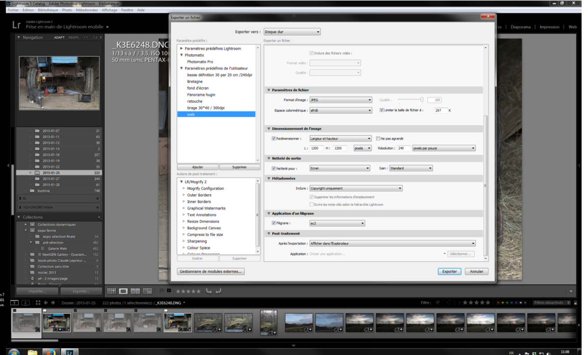 Il faut utiliser le menu " exporter" et définir les paramètres qui vont bien. Perso pour le forum, j'utilise largeur et longueur = 1200 px et 240 DPI en définissant 297 ko à la taille max du fichier.