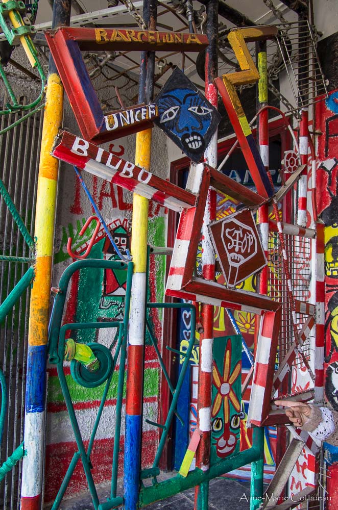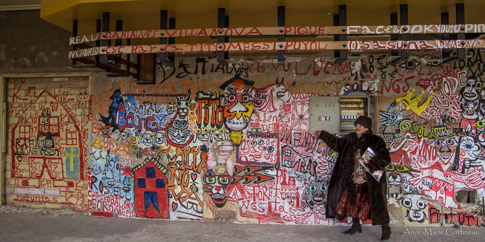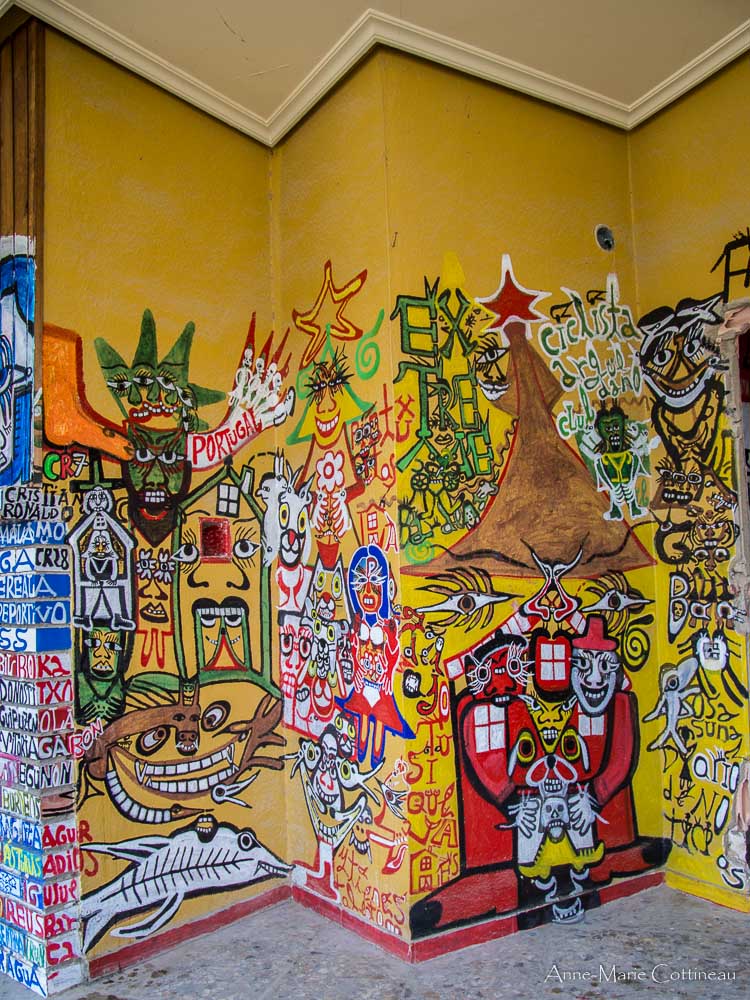 Les "pinturitas" de Maria-Angel Fernandez, une artiste rencontrée aux portes des Bardenas à ARGUEDAS. Cette femme peint depuis 15 ans les murs extérieurs, intérieurs... d'une ancienne discothèque. Art brut, naïf ou immédiat peu importe la définition de ce travail. Maria-Angel nous a expliqué la signification de ses dessins. Nous nous étions arrêtés pour observer ces "tags" hors du commun, nous avons rencontré une artiste peu banale.