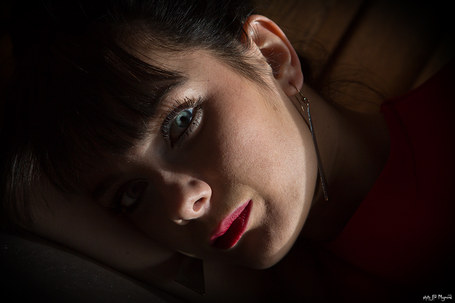l'ombre coube sur la joue et le menton, c'est un peu dommage, tu aurais peut-être pu reculer légèrement ta source pour lui donner un champs un poil plus large, sans modifier son angle, qui est parfait pour son regard