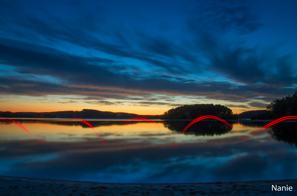 En fait ce ne sont que des essais. Il faut que j'affine les temps d'expo car cette dernière série est faite de 2 photos en surimpression : le paysage puis le "fil rouge"