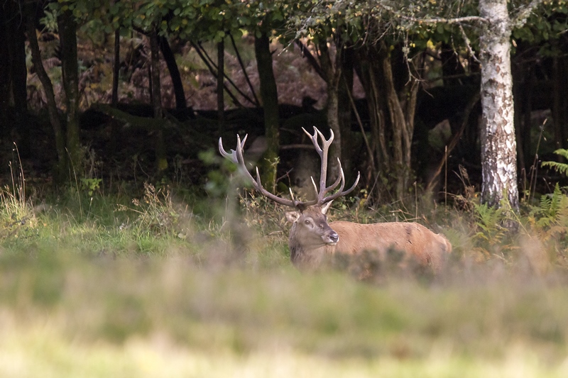 Depuis trois soirs, à 200m de moi environ, il crie son défi à tous ses congénères des environs, et je n'arrive pas à le voir, sauf une ombre rapide à la nuit tombante, impossible à shooter ; ce soir, je profite d'un vent favorable et du terrain pour me glisser plus près, dans une petite dépression où je reste un moment, le nez dans l'herbe ; puis doucement, très doucement, retenant ma respiration, je relève simultanément tête et objectif, ... il est là, à 100m à peine, superbe, majestueux, ... le cœur tape un peu plus vite, je ne bouge plus ; je le regarde dans le zoom : 14 cors, la tête est superbe, je ne vois plus que lui et je commence à shooter (pas en rafale hein, juste une image de temps en temps, de peur qu'il n'entende) ; brusquement il vient doucement vers moi, et là je n'en mène pas large, rien près de moi, pas un arbre, pas la moindre protection, une petite dose d'adrénaline déboule dans ma carcasse : 200 kg et de jolis porte-manteaux où je ne me vois pas accroché, ... puis il se détourne et va calmement vers ses biches ; je me suis juste un peu fait peur et je sais que je n'ai pas été très prudent, mais quel inoubliable moment.