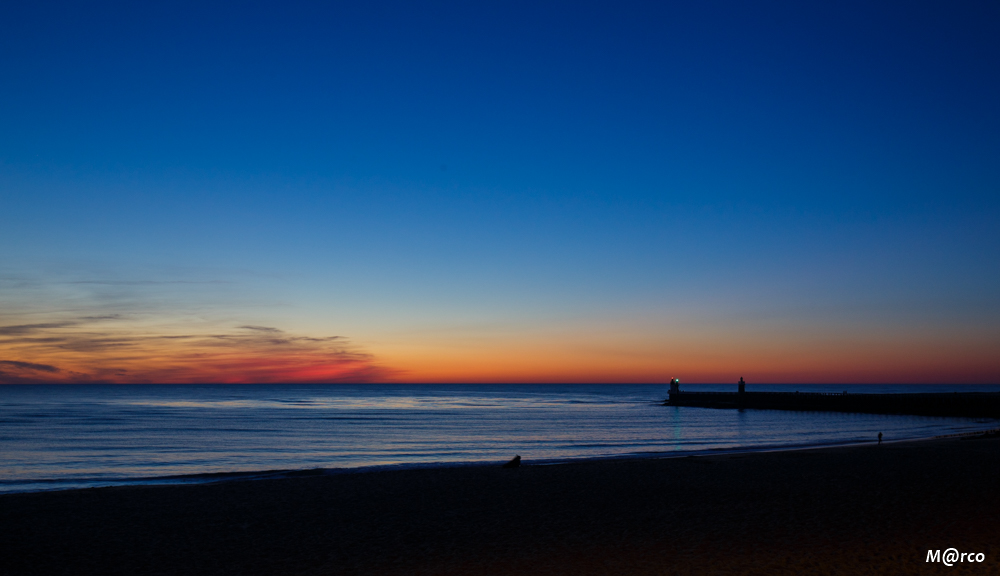 coucher de soleil sur la mer à Capbreton, et soirée nuageuse sur une plage d'Hossegor avec les pyrénées atlantiques en fond
