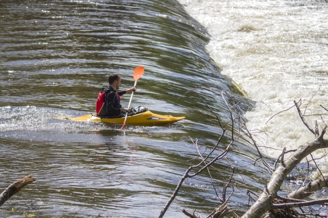 Dimanche matin, la Creuse avait un gros débit, et l'eau était, pour le moins fraiche, alors, pour franchir l'écluse du moulin de La Barde à La Celle Dunoise, il valait mieux choisir la bonne veine ... d'eau ; les trois premiers ont bien choisi, en rasant l'arbre couché, le quatrième a peut être eu peur de s'approcher, mais n'étant pas dans la bonne veine, il a planté dans les rochers, sans casse toutefois.