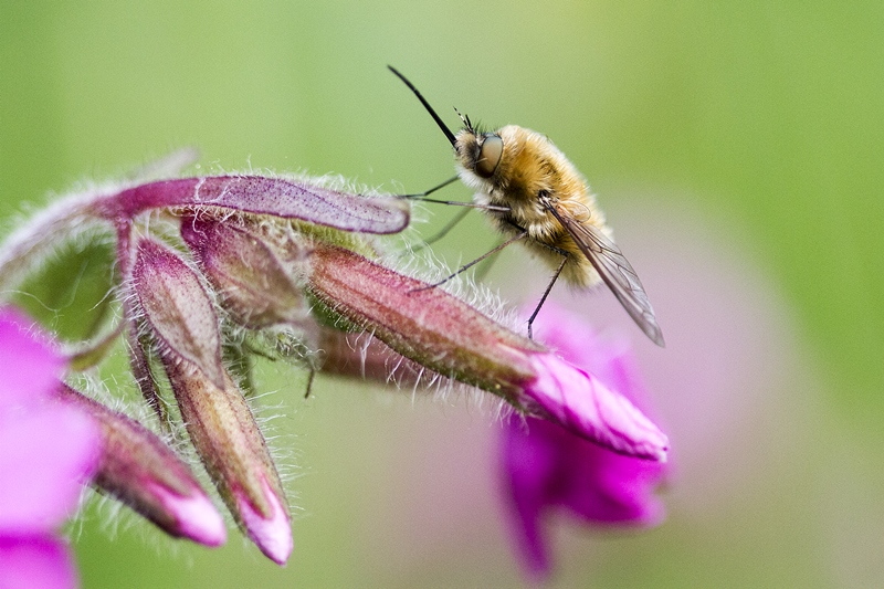 Série bombyles sur fleurs de compagnon rose ; le temps est gris et frais et ces petites mouches sont nettement plus calmes qu'en plein soleil.