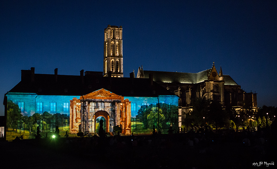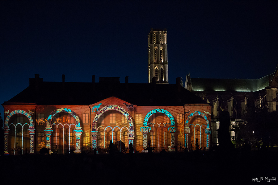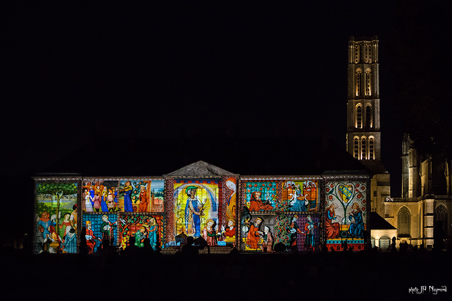 Beau spectacle en effet ( quoique les choix musicaux puissent être discutables ) qui habille la facade de l'évéché. Les sculptures de Marc Petit y prennent, du coup, une nouvelle dimension.
