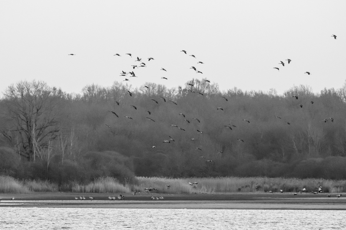 Lever à 5h hier pour arriver avant le lever du soleil, afin de voir les grues décoller au matin. Bien arrivés assez tôt mais le temps de trouver un spot où l'on puisse se garer et les observer, le soleil était levé.